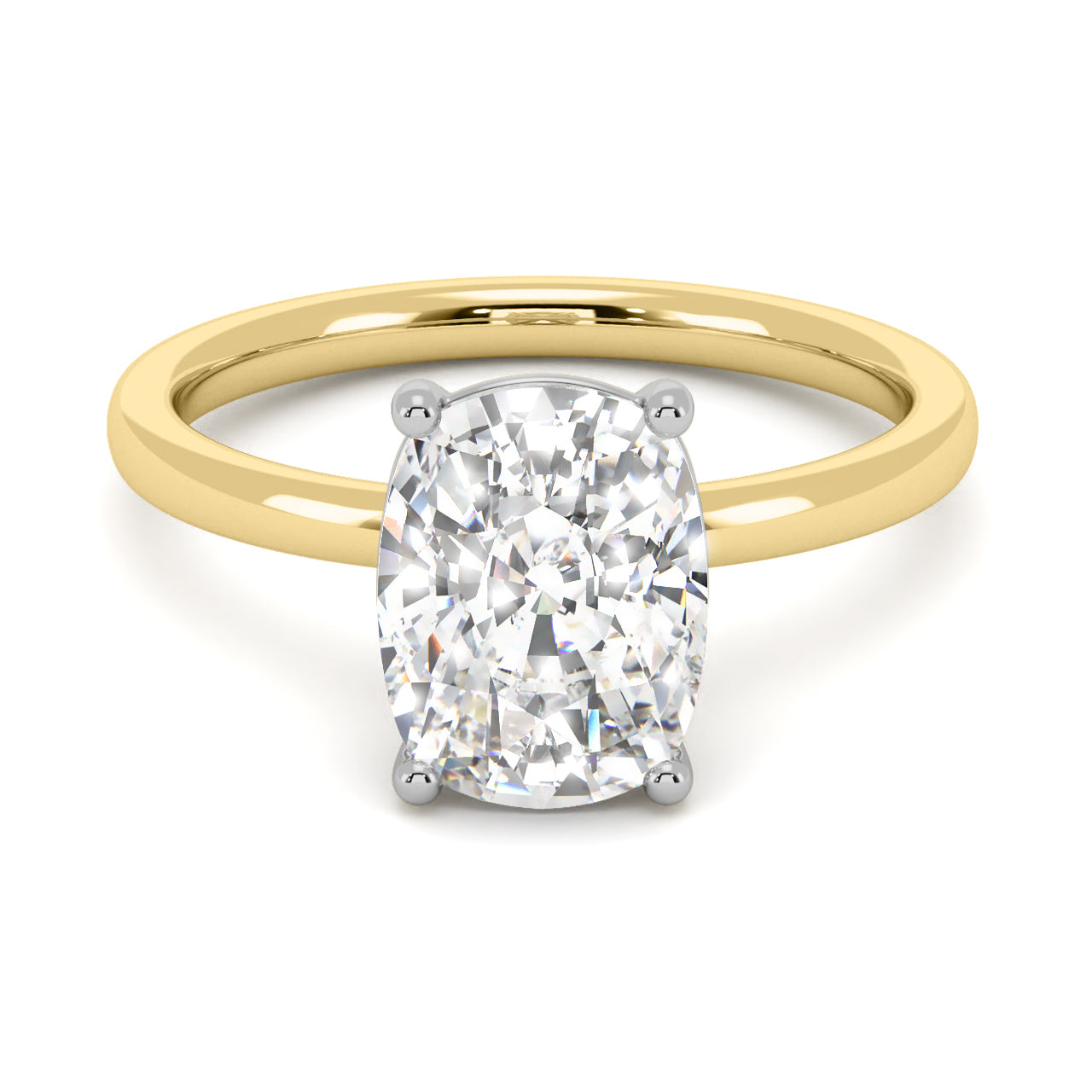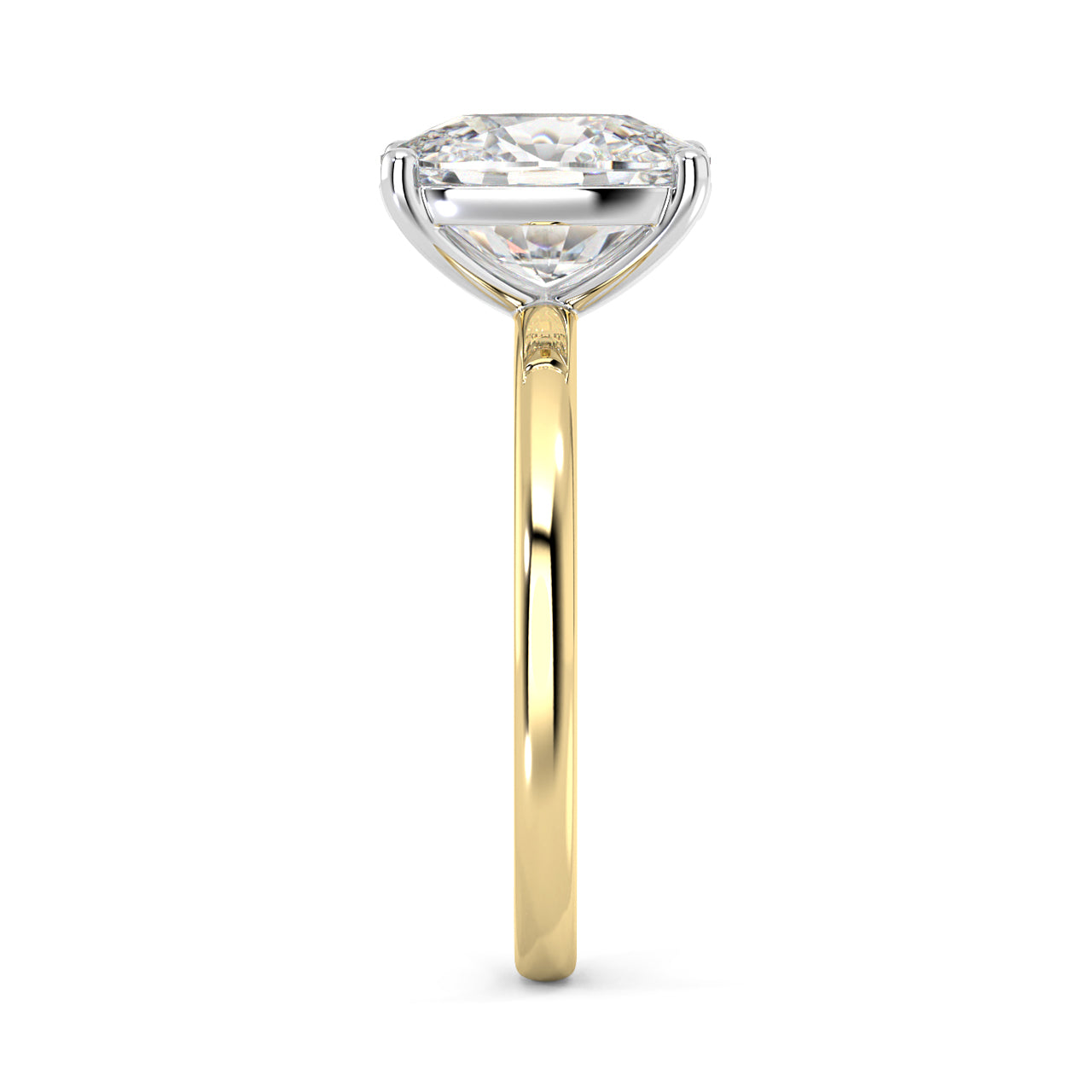 The Upper West Side Ring features a striking two-tone style with an 18 Karat Yellow Gold band and a White Gold head, creating a beautiful contrast that highlights the brilliance of the center stone.